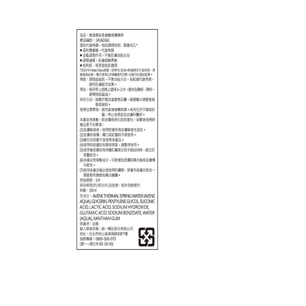這款雅漾極效多重酸煥膚精萃適合粉刺肌或油性肌膚使用,能幫助代謝角質、調理油脂分泌。建議每天早晚各使用1次,塗抹於臉部和頸部,避免接觸眼部區域。使用前,若你是敏感肌,建議先在手腕內側進行皮膚過敏測試,等待24小時確認無不適再使用。使用期間及使用後一週內,請務必做好防曬,避免陽光直射,並穿著保護性衣物。儲存時請放置於陰涼乾燥處,遠離高溫和火源。若使用後有持續紅腫或不適,請立即停用並諮詢皮膚科醫師。