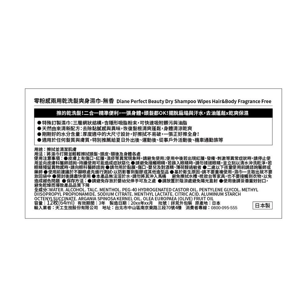 用 cosGlint 肌智 AI 來分析 零粉感兩用乾洗髮爽身濕巾-無香適不適合你,一款二合一乾洗髮與身體清潔濕巾,適合頭髮與身體使用,能快速去油蓬鬆並保濕乾爽,無香設計。;特殊訂製三層網狀結構濕巾,含隱形吸脂粉末,快速吸附髒污與油脂;天然由來清新配方,去除黏膩感與異味,恢復髮根清爽蓬鬆,身體清涼乾爽;適中水分含量與大尺寸設計,厚度適中易擦拭,一張可擦全身