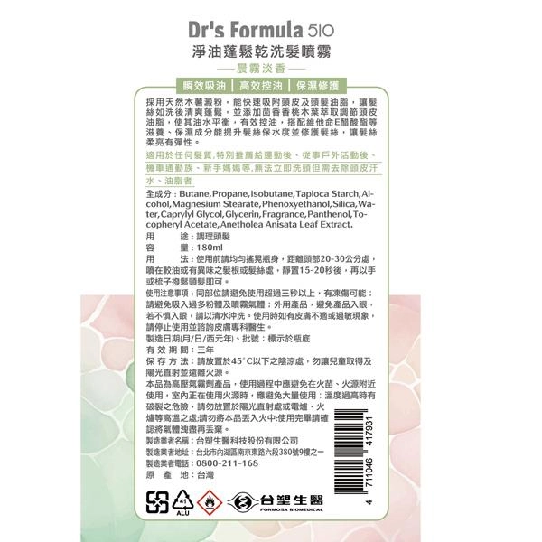510 淨油蓬鬆乾洗髮噴霧 - 晨霧淡香