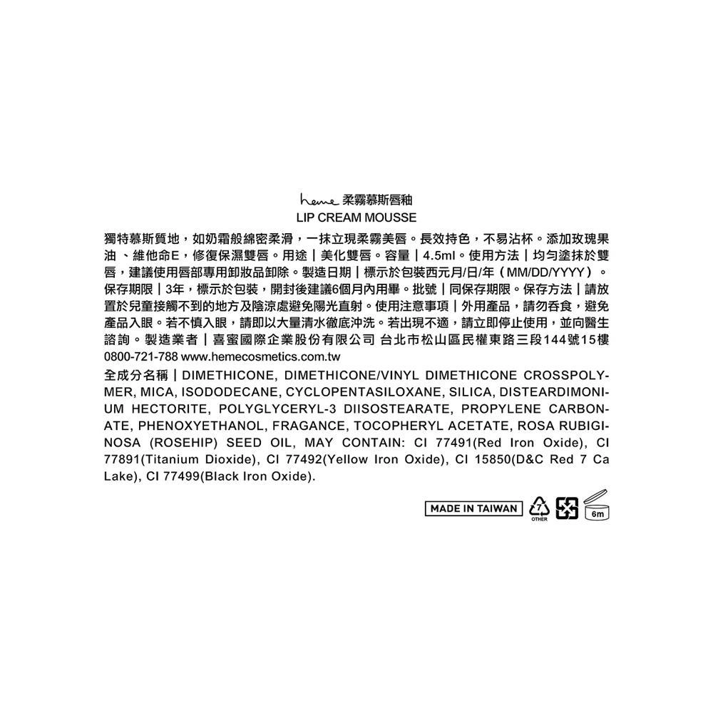 用 cosGlint 肌智 AI 來分析 柔霧慕斯唇釉 (LIP CREAM MOUSSE)適不適合你,一款具有獨特慕斯質地的唇釉,質地如奶霜般綿密柔滑,打造柔霧美唇,長效持色且不易沾杯,同時保濕修復雙唇。;獨特慕斯質地,綿密柔滑;長效持色,不易沾杯;添加玫瑰果油與維他命E,保濕修復雙唇