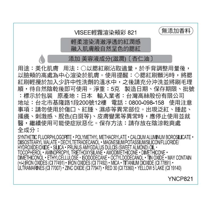 用 cosGlint 肌智 AI 來分析 輕霧渲染頰彩 821適不適合你,一款輕柔渲染清澈淨透紅潤感的腮紅,融入肌膚般自然呈色,無添加香料。;輕柔渲染,呈現清澈淨透的紅潤感;融入肌膚般自然呈色;添加美容液成分(滋潤),含杏仁油