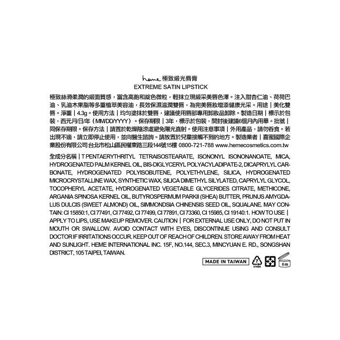 用 cosGlint 肌智 AI 來分析 heme 極致緞光唇膏 EXTREME SATIN LIPSTICK適不適合你,極致絲滑柔潤的緞面質感,富含高飽和綻色微粒,輕抹立現緞采美唇色澤。注入甜杏仁油、荷荷巴油、乳油木果脂等多重植萃美容油,提供長效保濕滋潤雙唇,為完美唇妝增添健康光采。;極致絲滑柔潤的緞面質感;富含高飽和綻色微粒,提供緞采美唇色澤;注入多重植萃美容油,如甜杏仁油、荷荷巴油和乳油木果脂,提供長效保濕滋潤
