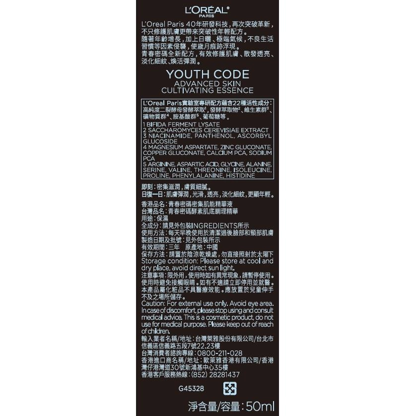 用 cosGlint 肌智 AI 來分析 Youth Code Advanced Skin Cultivating Essence適不適合你,L'Oréal Paris的青春密碼系列精華液,結合40年研發科技和22種活性成分,專為修護肌膚、淡化細紋並提供年輕化效果而設計。;有效修護肌膚;散發透亮;淡化細紋;煥活彈潤;密集滋潤;膚質細膩
