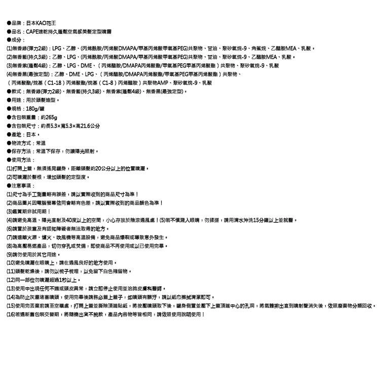 用 cosGlint 肌智 AI 來分析 CAPE速乾持久蓬鬆空氣感美要定型噴霧適不適合你,一種速乾、持久的頭髮定型噴霧,提供不同級別的定型效果,包括彈力、持久、蓬鬆和最強定型選項。;速乾;持久;蓬鬆;空氣感;多款式選擇(無香絲、藍、紫、黑);適用於頭髮造型