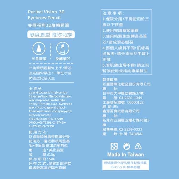 用 cosGlint 肌智 AI 來分析 Perfect Vision 3D Eyebrow Pencil適不適合你,一款3D旋轉眉筆,用於輕鬆描繪和美化眉型,提供自然且可控的眉毛造型。;三角筆頭輕鬆好上手;筆芯長短隨你掌控;自然眉型宛若天生
