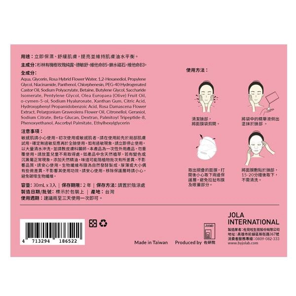 本產品為一次性留置型面膜,建議依包裝使用方式敷貼15–20分鐘後取下,不需清洗並勿重複使用。使用頻率依包裝建議為每2–3天一次。使用前在手腕內側或耳後等局部做24小時貼布測試,無異常(紅、腫、刺痛、灼熱或起疹)方可於臉部使用。若使用中或使用後出現不適,立即停止使用並以大量清水沖洗,必要時請就醫。孕婦、哺乳者、嬰幼兒及高度敏感肌因含精油與防腐劑成分(如天竺葵精油、香茅醇、香葉醇、苯氧乙醇、氯苯甘醚等)建議謹慎使用或先諮詢專業醫師。避免接觸眼睛與破損皮膚;儲存於陰涼乾燥處並置於兒童不易取得處。本分析基於成分清單,未有各成分濃度資訊;若需釐清防腐劑或精油含量以評估風險,應以原廠提供之濃度資料為準。