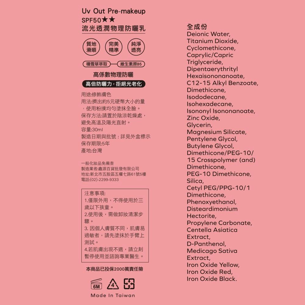 用 cosGlint 肌智 AI 來分析 Uv Out Pre-makeup SPF50✰✰ 流光透潤物理防曬乳適不適合你,這是一款物理防曬乳,提供SPF50高倍防曬保護,質地滑順透亮,能修飾膚色並拒絕光老化。;質地完美純淨;滑順精準透亮;高係數物理防曬;高倍防曬力,拒絕光老化;修飾膚色