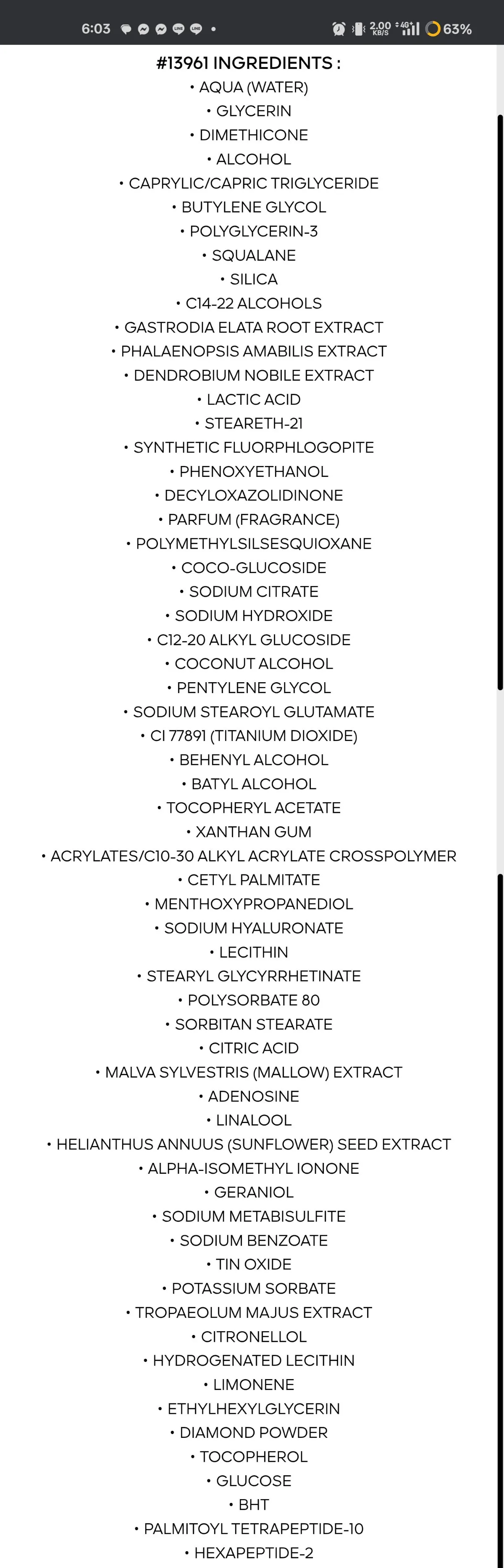 用 cosGlint 肌智 AI 來分析適不適合你,根據提供之成分表,產品為含水基底的保養品(可能為精華液或乳霜),含多種保濕劑(甘油、丁二醇、透明質酸鈉等)、角鯊烷與酯類油脂作為潤澤成分,並含多種植物萃取物、胜肽(Palmitoyl tetrapeptide-10、Hexapeptide-2)、抗氧化劑(維生素E衍生物、生育醇)與常見防腐/香精成分。配方包含矽靈(Dimethicone、Polymethylsilsesquioxane)和粉體(Titanium Dioxide、Synthetic Fluorphlogopite、Diamond Powder)可能影響觸感與視覺效果。;含多種保濕吸水成分:Glycerin、Butylene Glycol、Sodium Hyaluronate(透明質酸鈉);含親膚油脂與皮膚潤滑成分:Caprylic/Capric Triglyceride、Squalane、Cetyl/Behenyl/Stearyl 類脂醇與酯類(Cetyl Palmitate);含活性配方:胜肽(Palmitoyl Tetrapeptide-10、Hexapeptide-2)、Adenosine,可作為肌膚調理/抗老支持成分