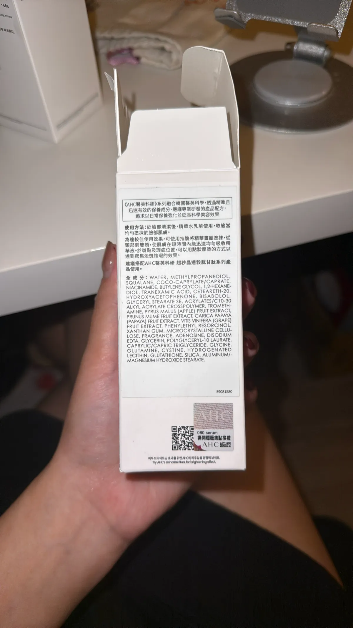 用 cosGlint 肌智 AI 來分析 080 serum適不適合你,AHC 醫美科研系列亮白精華液,訴求快速吸收與局部密集淡斑,建議於清潔後、化妝水前使用,可點塗或以指腹按摩促進吸收。;含多種亮白/抑制黑色素成分(如 Niacinamide、Tranexamic Acid、Phenylethyl Resorcinol、Glutathione);含保濕與柔膚油脂(Squalane、Caprylic/Capric Triglyceride、Glyceryl Stearate SE)提高皮膚潤澤感與塗抹順滑度;採用低黏度載體(Methylpropanediol、Butylene Glycol)促進成分滲透並快速吸收