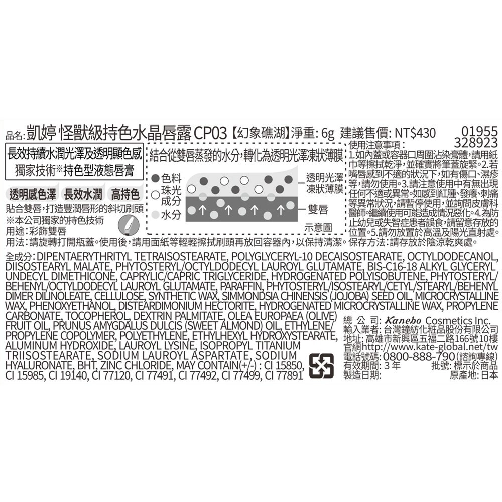 用 cosGlint 肌智 AI 來分析 凱婷 怪獸級持色水晶唇露 CP03適不適合你,色彩持久的液態唇露,訴求透明光澤與長效水潤,同時具高顯色與珠光感。含刷頭設計,方便塗抹。;長效持色與透明光澤凍狀薄膜配方;結合吸水/鎖水成分提供水潤感;含珠光/色料以提升顯色與光澤;斜切刷頭,貼合唇型方便上色