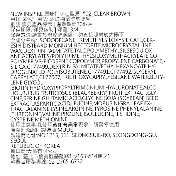 用 cosGlint 肌智 AI 來分析 mude New Inspire 眉睫打底定型膏_#02_Clear Brown適不適合你,眉睫打底定型膏,主要功能為幫助睫毛定型、增加色澤(棕色)、並含保濕與護髮類胺基酸與維生素B7(Biotin)等成分維持睫毛狀態。;睫毛定型與持妝(矽油與膠類成膜劑);帶有棕色色料,提供染色/調色效果(CI 77491/92/99);含保濕與胺基酸類成分、及Biotin,有助於維持睫毛柔順感