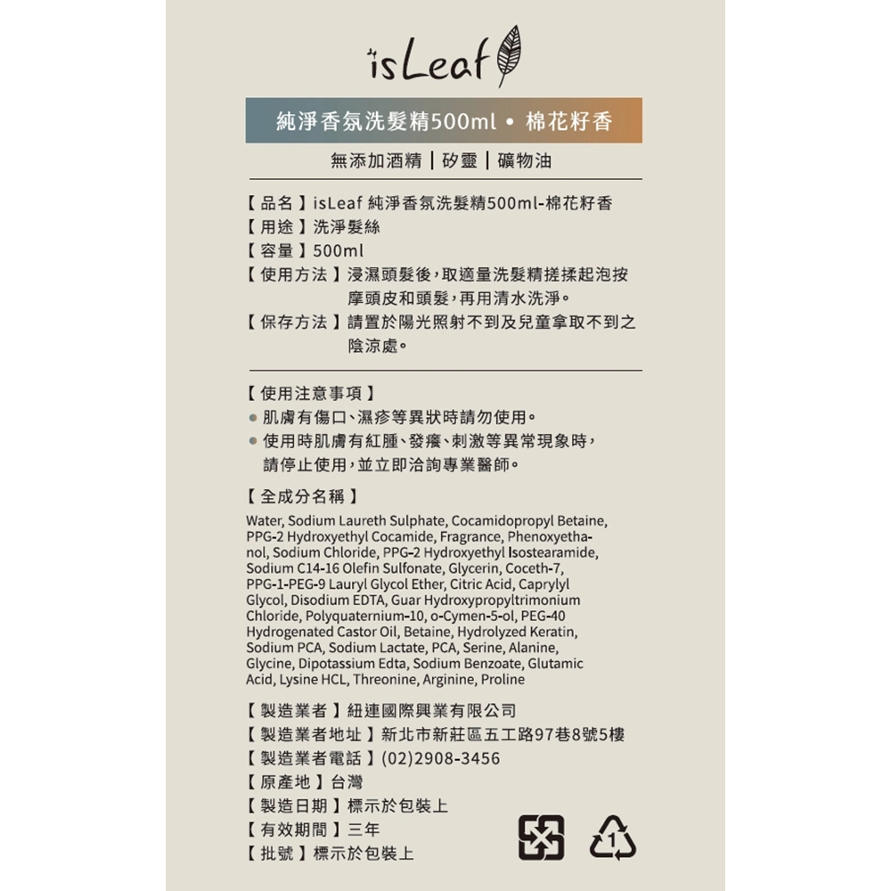 isLeaf純淨香氛洗髮精500ml-棉花籽香(氨基酸+絲蛋白)